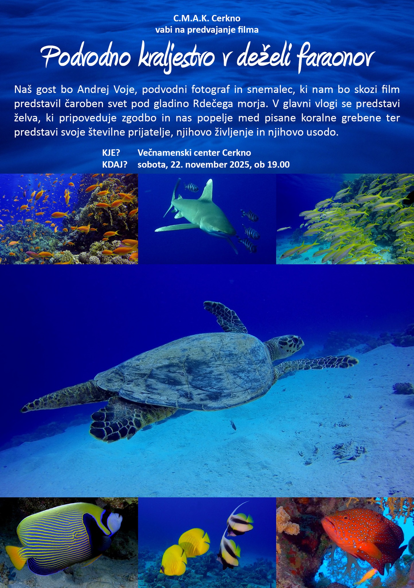Naš gost bo Andrej Voje, podvodni fotograf in snemalec, ki nam bo skozi film predstavil čaroben svet pod gladino Rdečega morja.